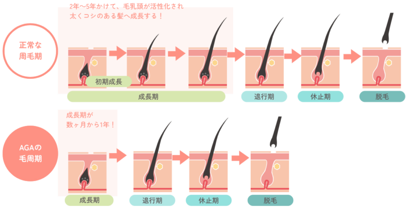 AGA治療は、すぐに発毛が起こるものではなく、毛周期(ヘアサイクル)に合わせて徐々に改善していきます。