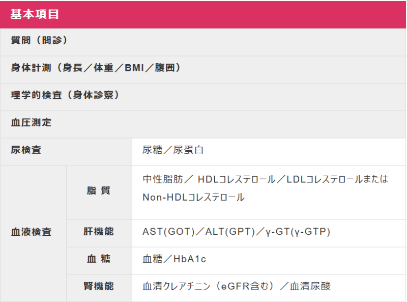 - 血液検査(貧血、肝機能、脂質、血糖など)